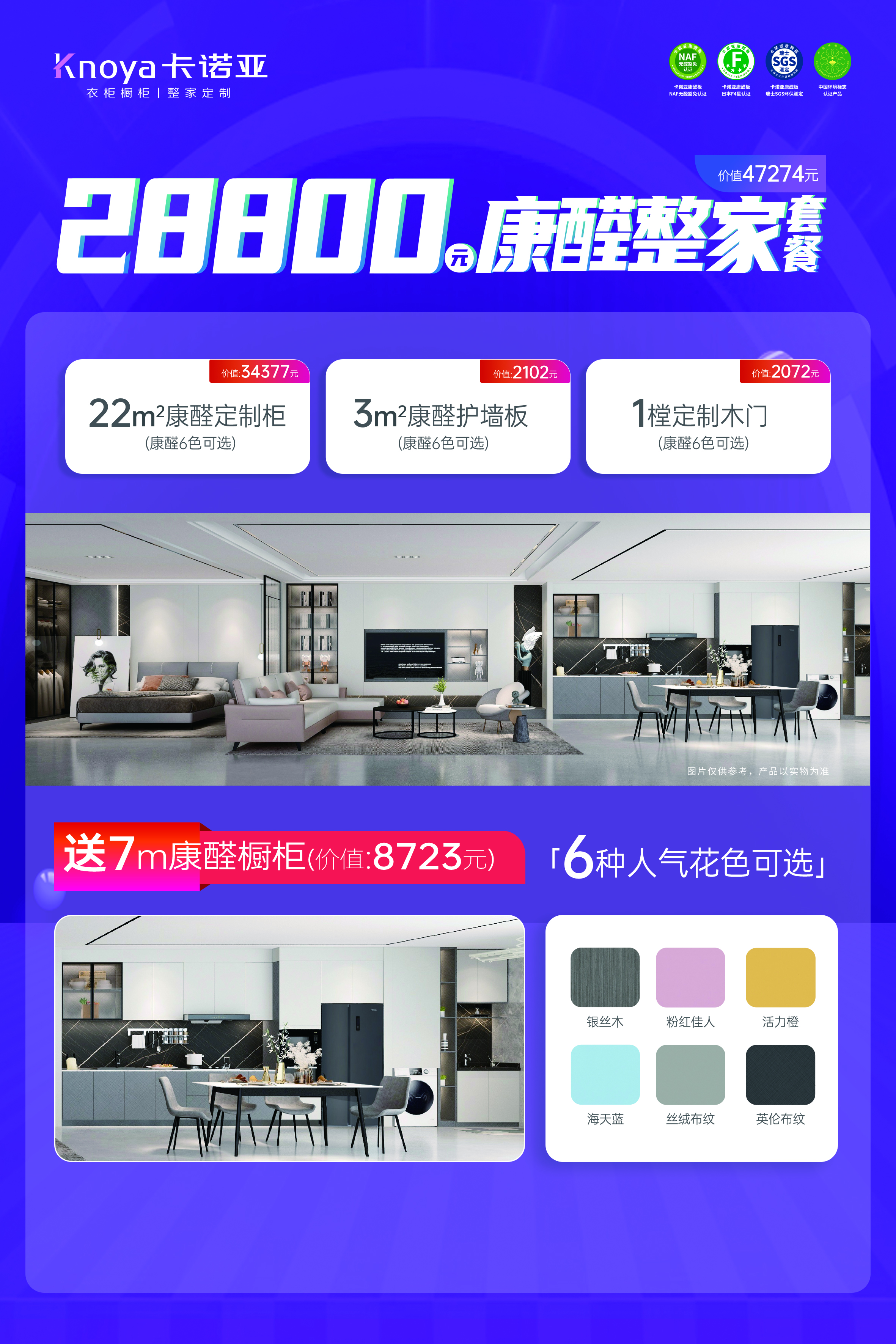 28800元康醛整家套餐,包括22㎡康醛定制柜+3㎡康醛护墙板+1樘木门,惊喜送7m康醛橱柜,一个套餐就能享受诸多福利。